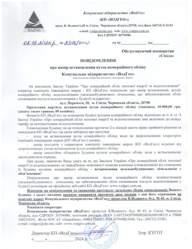 Повідомлення про намір встановлення вузла комерційного обліку по вул. Перемоги, 20 Запис опубліковано:02.12.2024 Категорія запису:Повідомлення про намір встановлення Прочитати більше статей Попередній записПовідомлення про намір встановлення вузла комерційного обліку по вул. Незалежності, 90 Наступний записПовідомлення про намір встановлення вузла комерційного обліку по вул. Юрія Кондратюка, 21а