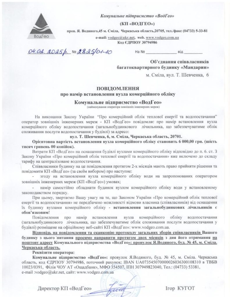 Повідомлення про намір встановлення вузла комерційного обліку по вул. Т.Шевченка, 6 Запис опубліковано:04.02.2025 Категорія запису:Повідомлення про намір встановлення Прочитати більше статей Попередній записПовідомлення про намір встановлення вузла комерційного обліку по вул. Т.Шевченка, 39б Наступний записПовідомлення про намір встановлення вузла комерційного обліку по вул. Т.Шевченка, 4