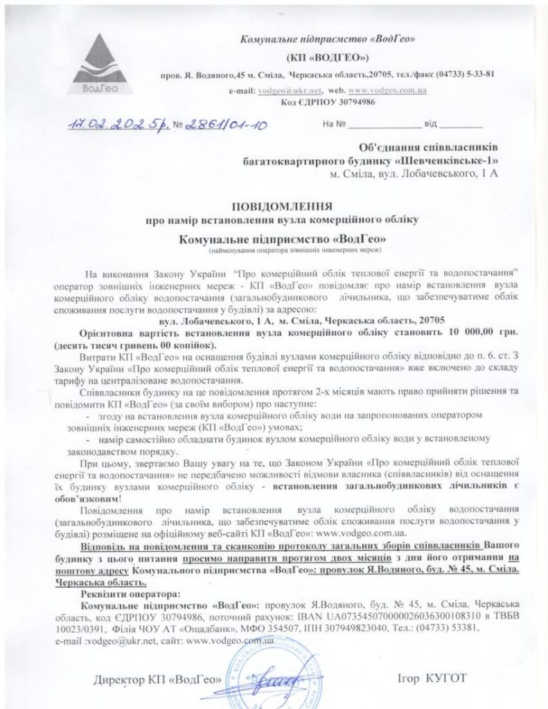 Повідомлення про намір встановлення вузла комерційного обліку по вул. Лобачевського, 1а Запис опубліковано:17.02.2025 Категорія запису:Повідомлення про намір встановлення Прочитати більше статей Попередній записПовідомлення про намір встановлення вузла комерційного обліку по вул. Михайла Вербицького, 93 Наступний записПовідомлення про намір встановлення вузла комерційного обліку по вул. Уманська, 16