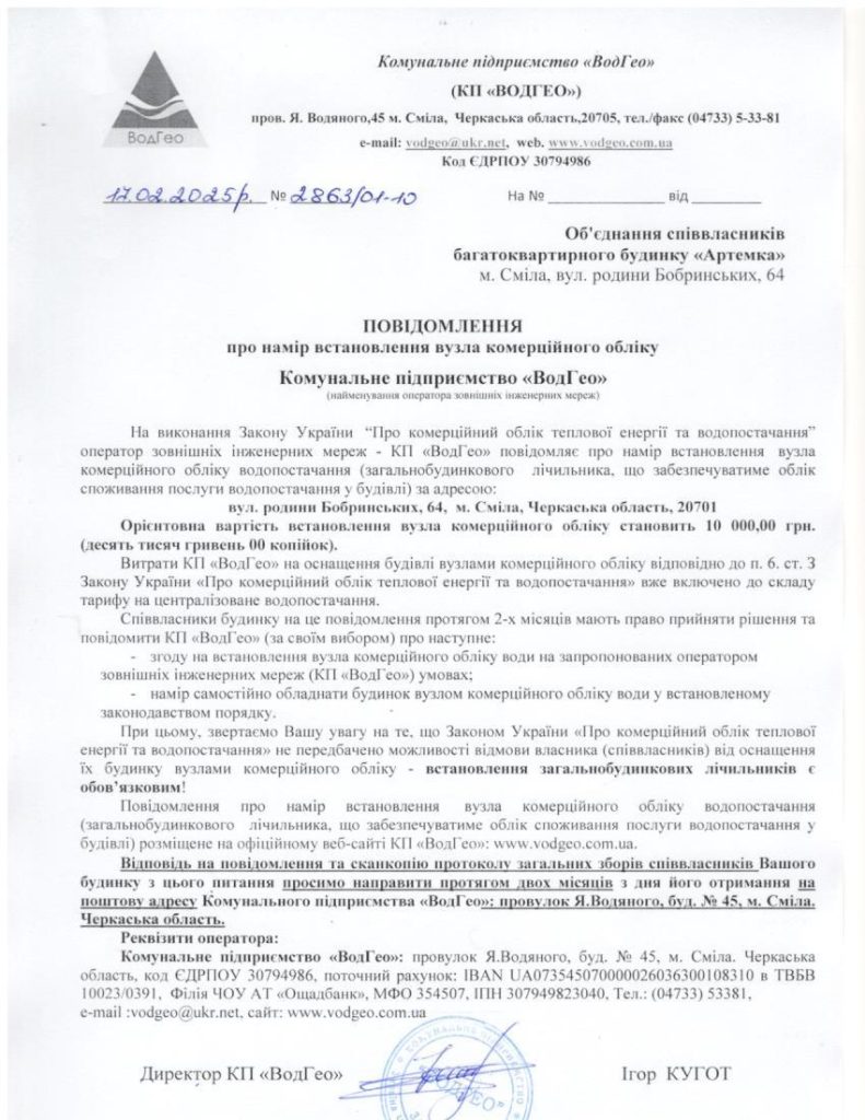 Повідомлення про намір встановлення вузла комерційного обліку по вул. родини Бобринських, 64