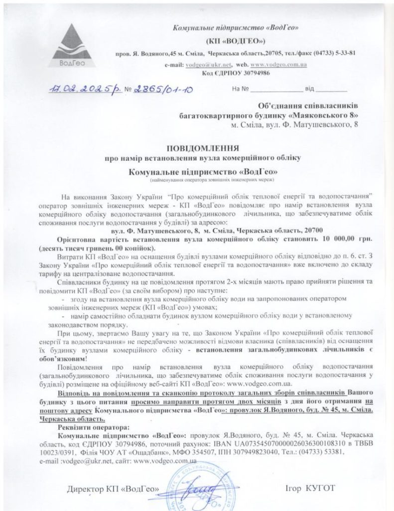 Повідомлення про намір встановлення вузла комерційного обліку по вул. Ф.Матушевського, 8 Запис опубліковано:17.02.2025 Категорія запису:Повідомлення про намір встановлення Прочитати більше статей Попередній записПовідомлення про намір встановлення вузла комерційного обліку по вул. Незалежності, 87 Наступний записПовідомлення про намір встановлення вузла комерційного обліку по вул. родини Бобринських, 134