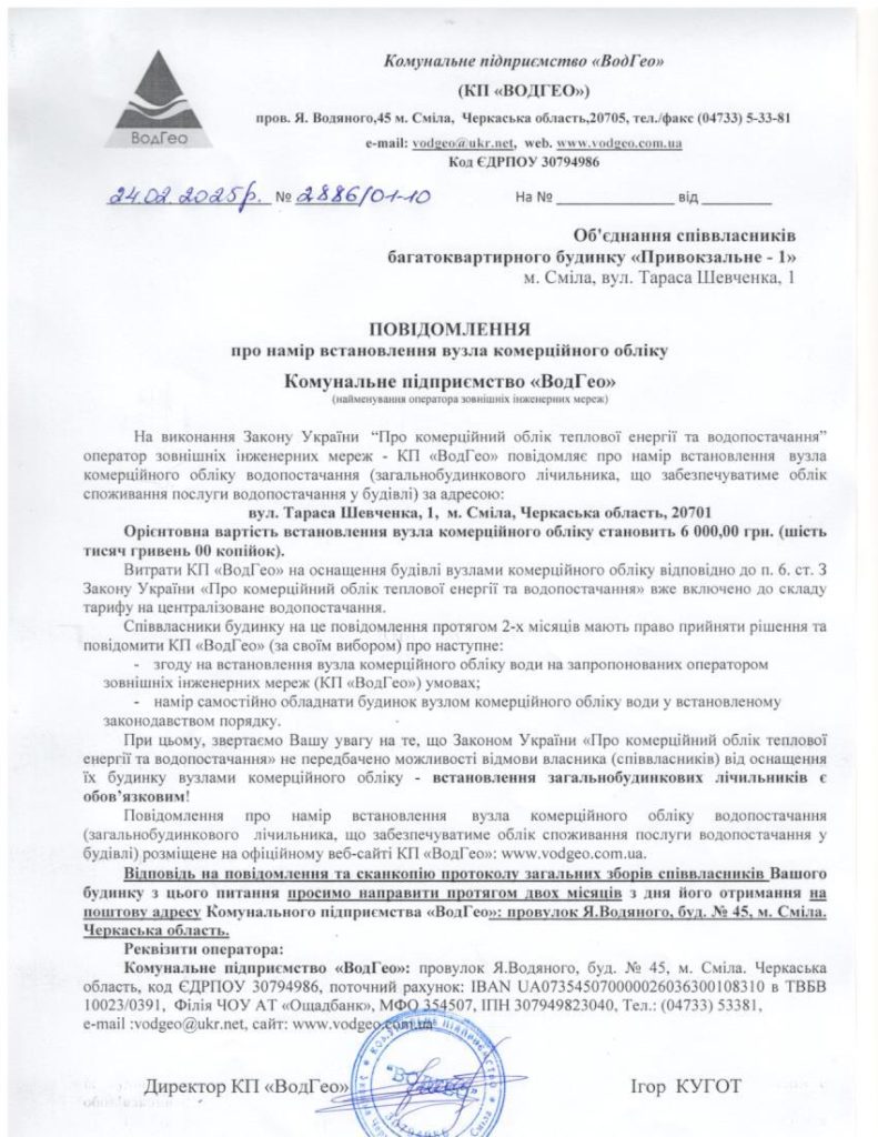 3. Повідомлення про намір встановлення вузла комерційного обліку по вул. Т.Шевченка, 1