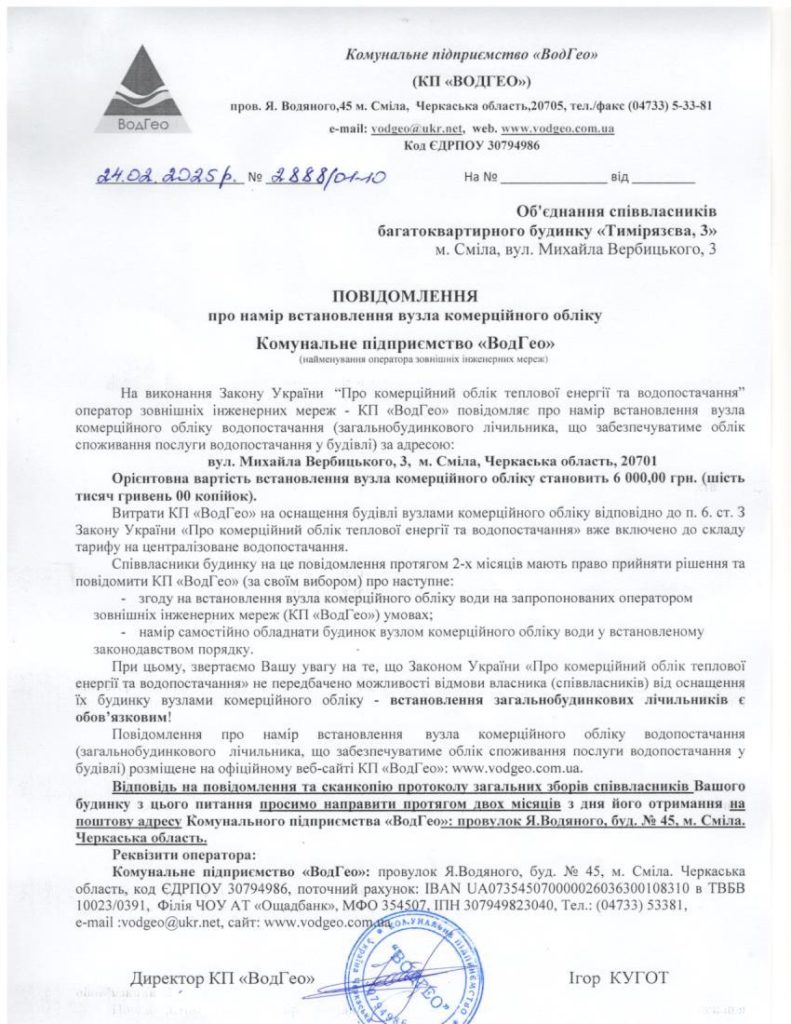 Повідомлення про намір встановлення вузла комерційного обліку по вул. Михайла Вербицького, 3 Запис опубліковано:24.02.2025 Категорія запису:Повідомлення про намір встановлення Прочитати більше статей Попередній записПовідомлення про намір встановлення вузла комерційного обліку по вул. Т.Шевченка, 8 Наступний записПовідомлення про намір встановлення вузла комерційного обліку по вул. Богдана Хмельницького, 26