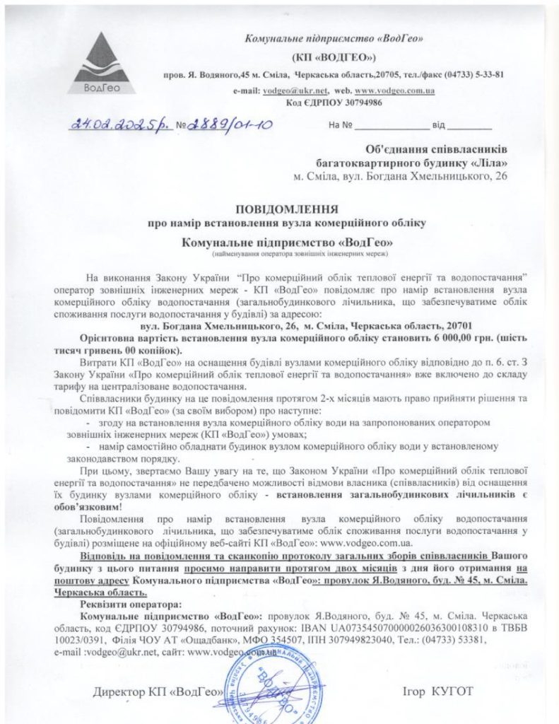 3. Повідомлення про намір встановлення вузла комерційного обліку по вул. Богдана Хмельницького, 26