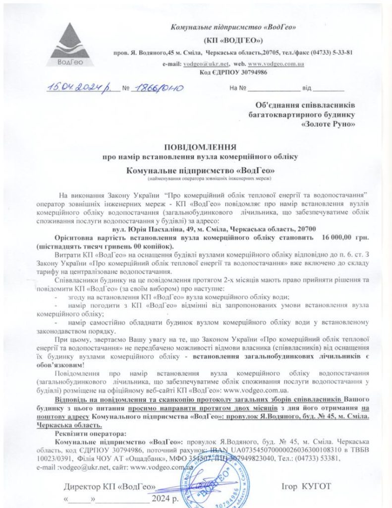 3. Повідомлення про намір встановлення вузла комерційного обліку по вул. Юрія Пасхаліна, 49