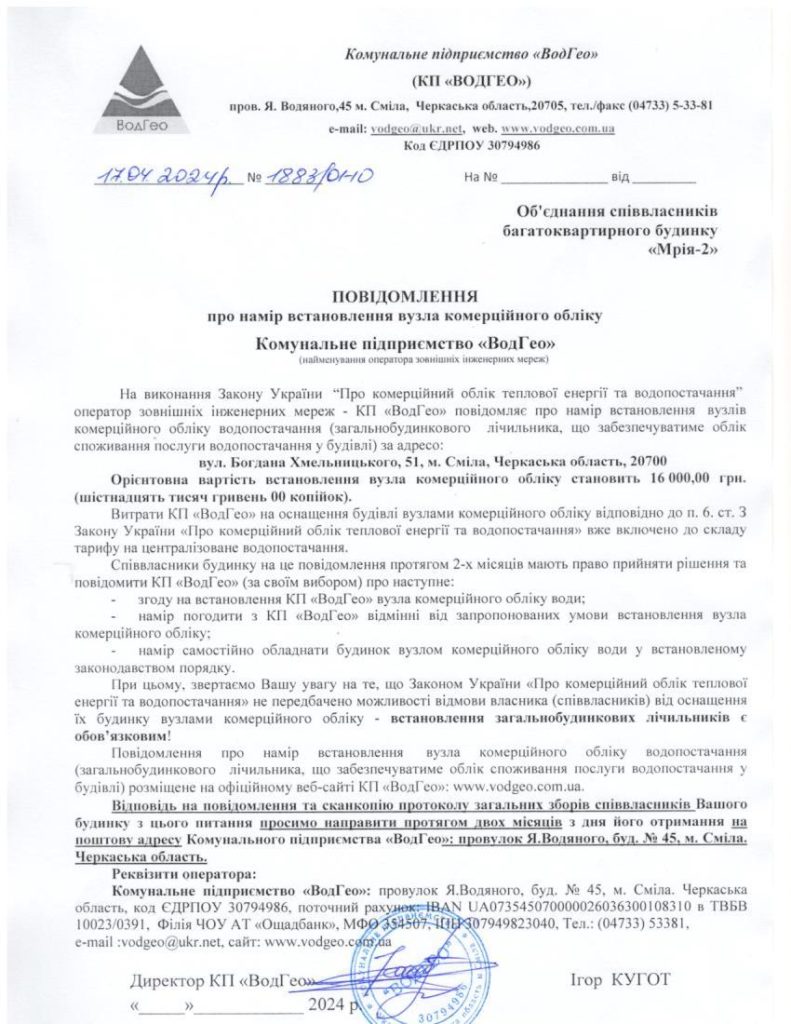 Повідомлення про намір встановлення вузла комерційного обліку по вул. Богдана Хмельницького, 51 Запис опубліковано:17.04.2024 Категорія запису:Повідомлення про намір встановлення Прочитати більше статей Попередній записПовідомлення про намір встановлення вузла комерційного обліку по вул. Заводська, 4 Наступний записУвага! Повторно. Роз’яснення щодо оснащення будівель вузлами комерційного обліку
