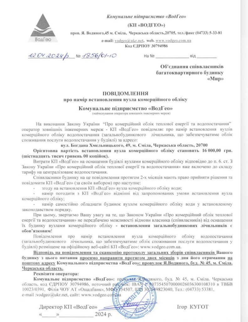 Повідомлення про намір встановлення вузла комерційного обліку по вул. Богдана Хмельницького, 49 Запис опубліковано:12.04.2024 Категорія запису:Повідомлення про намір встановлення Прочитати більше статей Попередній записПовідомлення про намір встановлення вузла комерційного обліку по вул. Мічуріна, 24 Наступний записПовідомлення про намір встановлення вузла комерційного обліку по провулку Павлова,14
