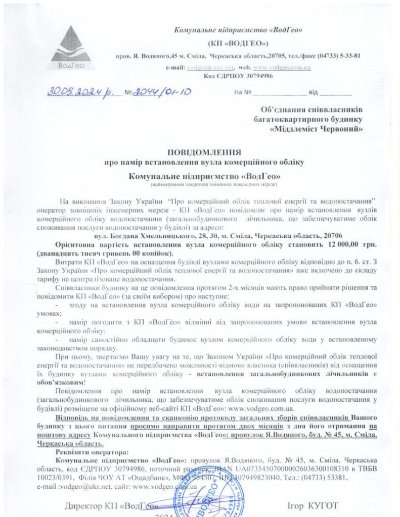 3. Повідомлення про намір встановлення вузла комерційного обліку по вул. Богдана Хмельницького, 28, 30