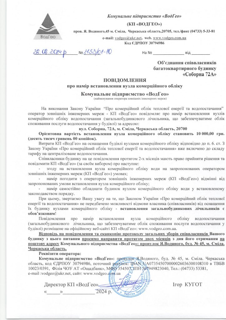 3. Повідомлення про намір встановлення вузла комерційного обліку по вул. Соборна, 72а