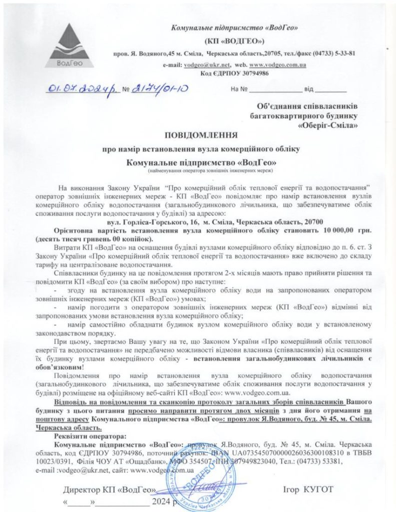 3. Повідомлення про намір встановлення вузла комерційного обліку по вул. Горліса-Горського, 16