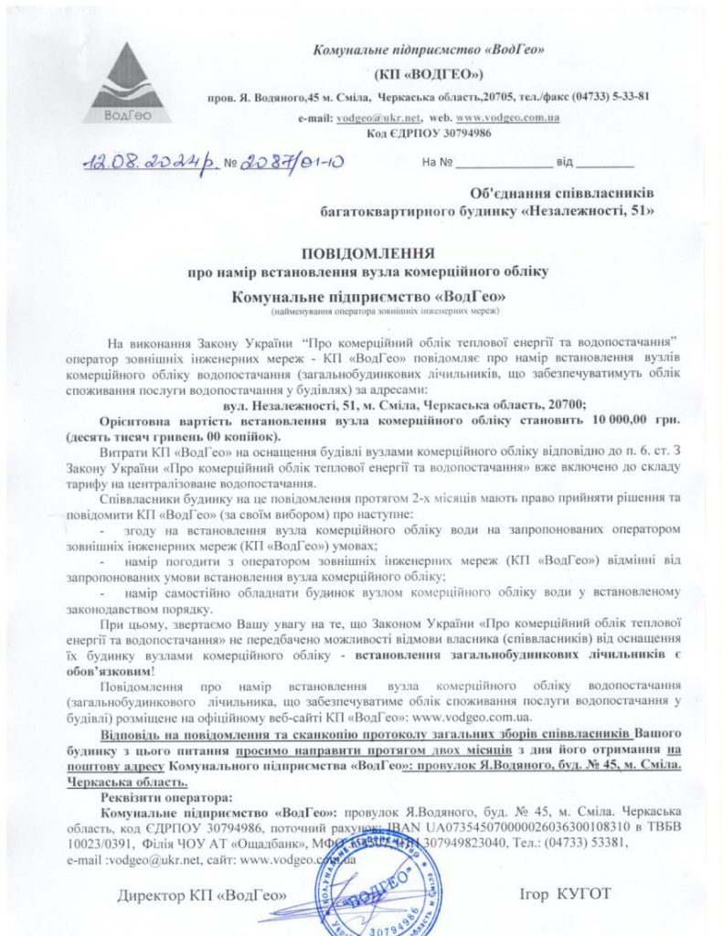 Повідомлення про намір встановлення вузла комерційного обліку по вул. Незалежності, 51